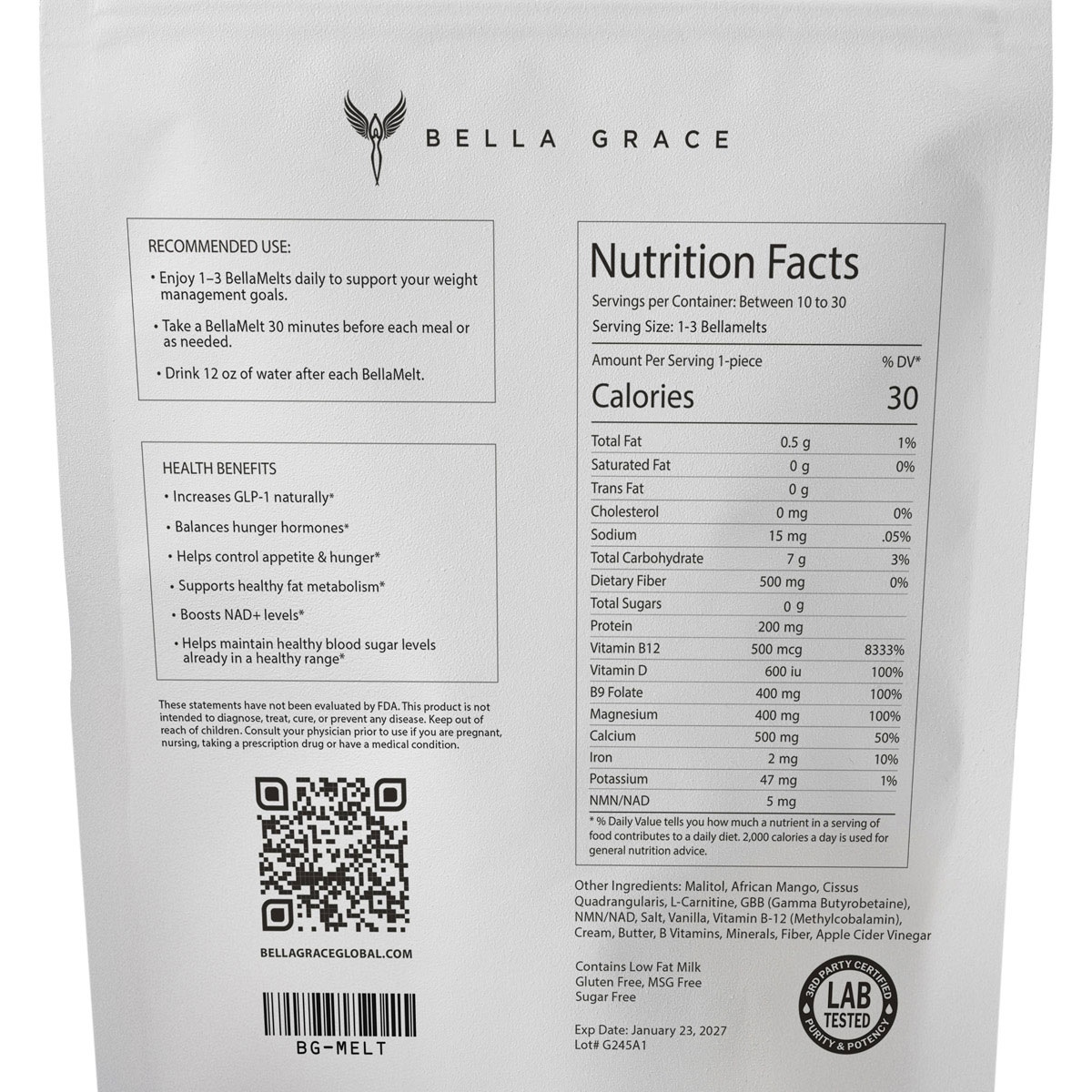 Enjoy 1-3 BellaMelts daily to support your weight management goals. Take 30 minutes before each meal or as needed. Follow with 12 oz. of water after each BellaMelt.